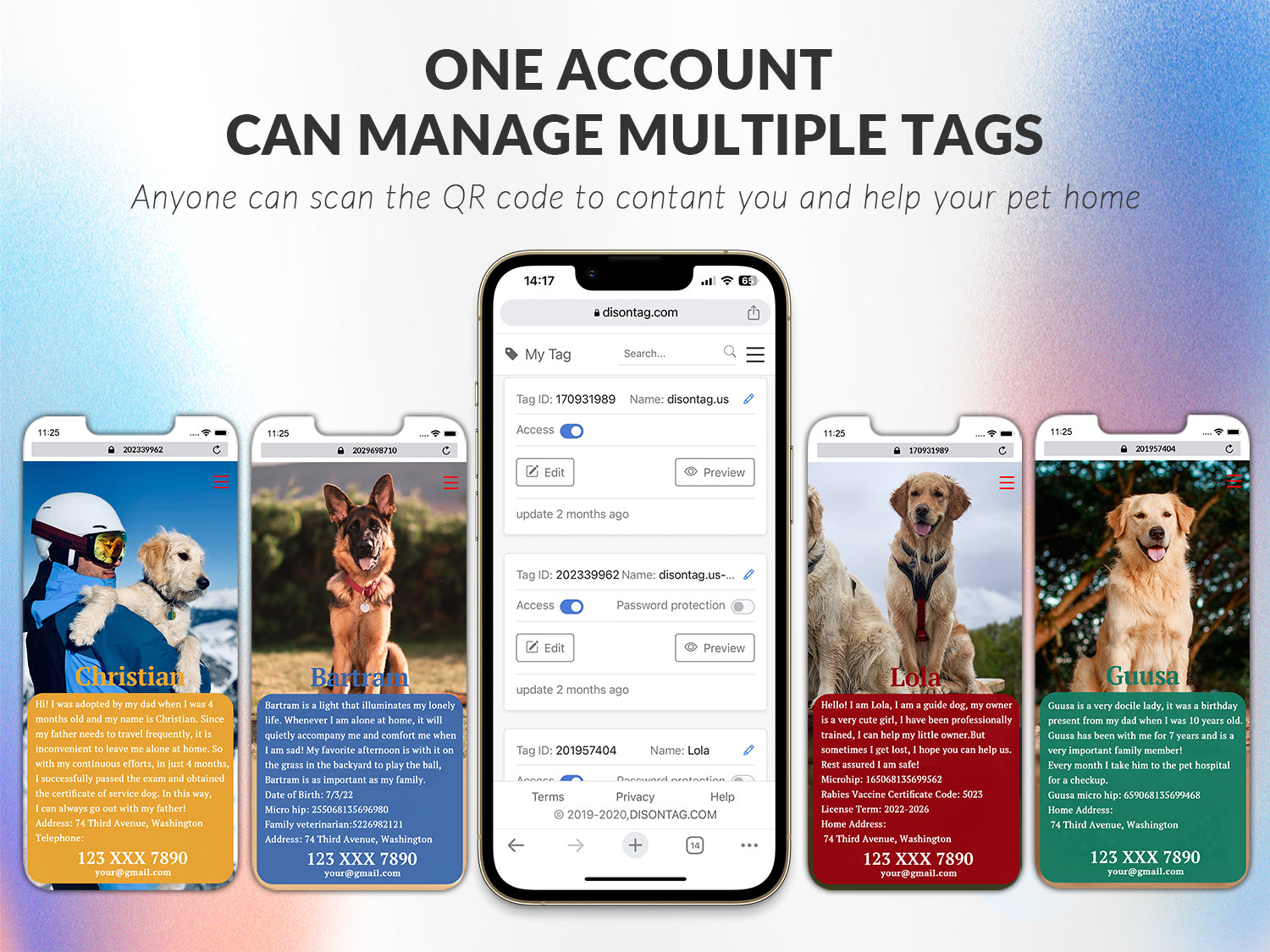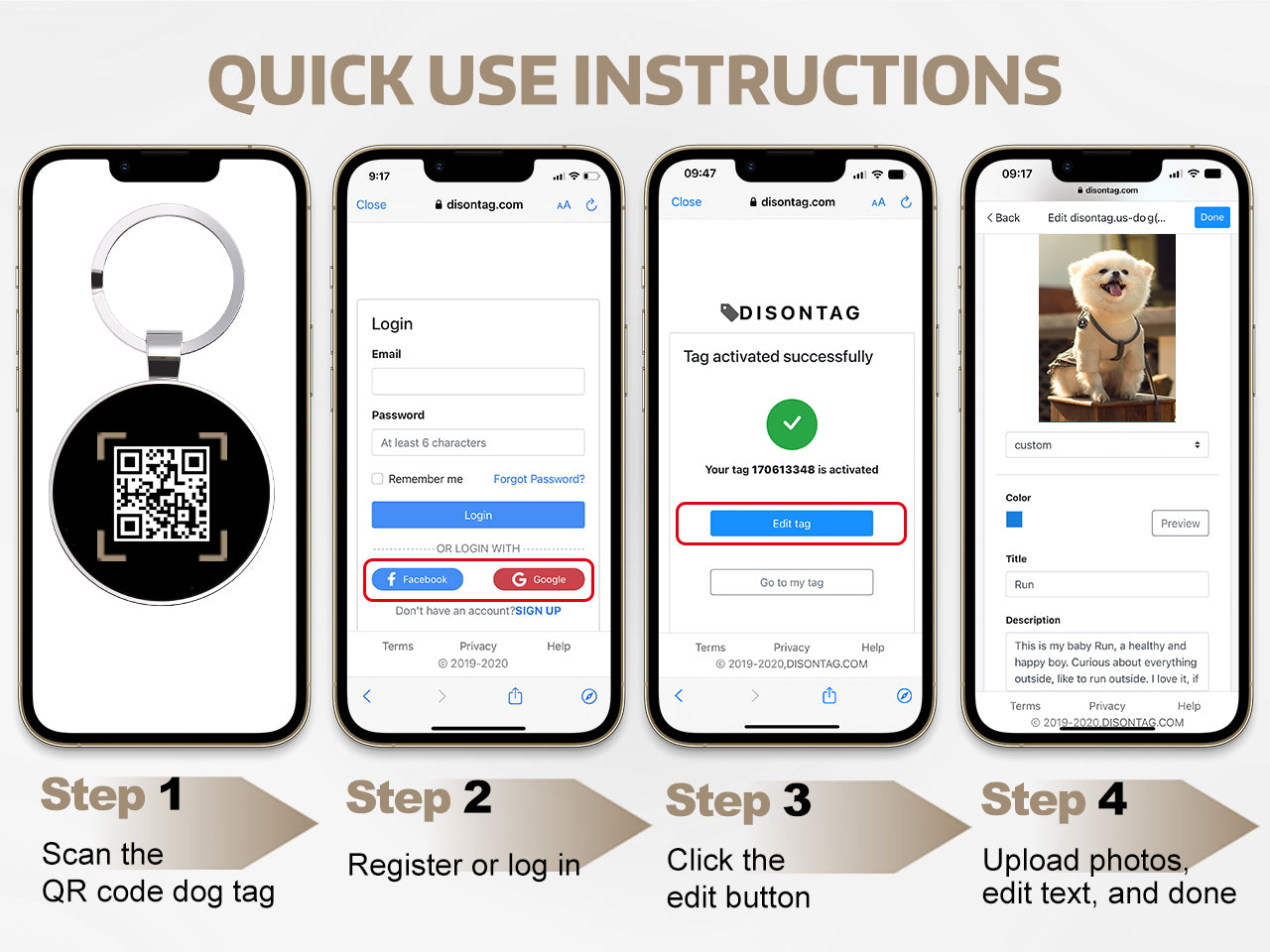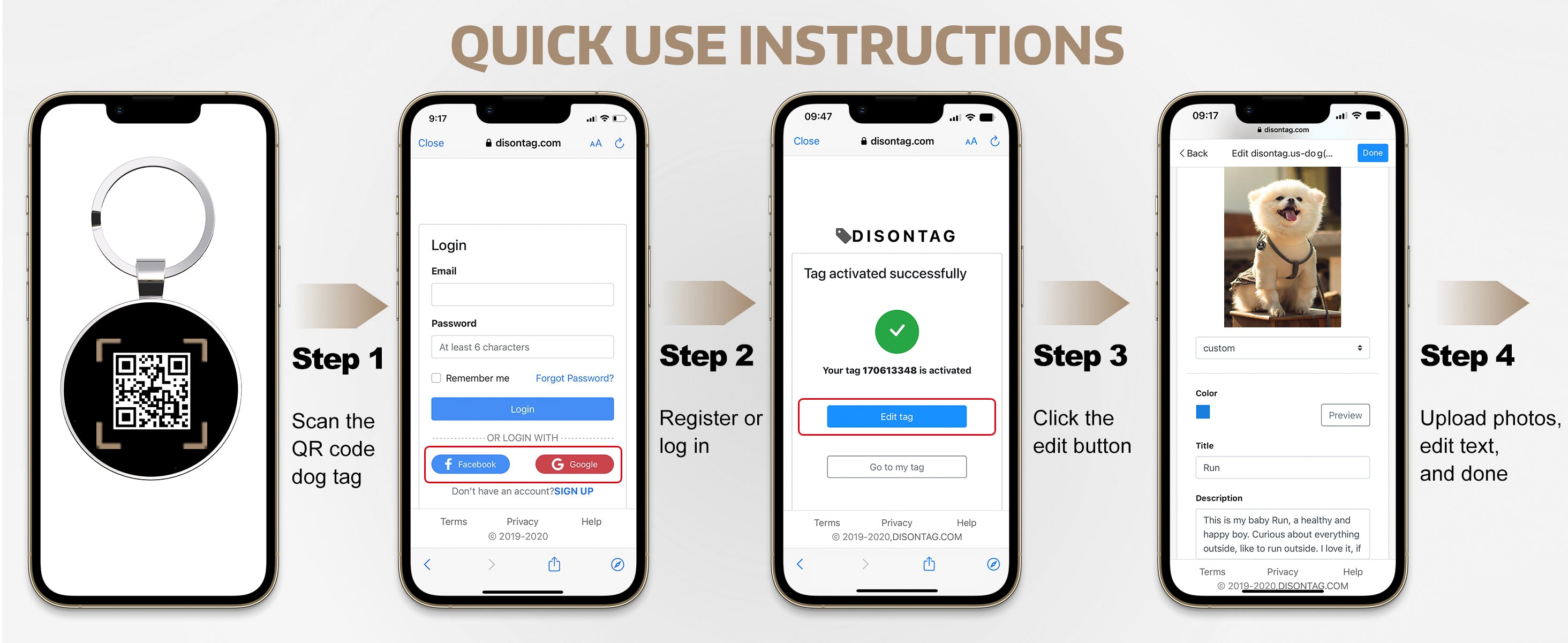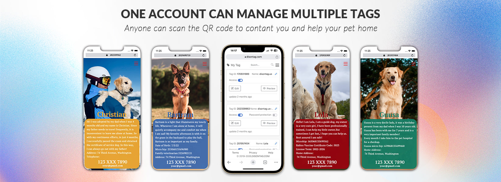 DISONTAG is a scannable QR code pet tag with an elastic pet page where you can upload 3 images and store contact information, behavior records, and veterinary details, all of which can be viewed within the page at any time Modify and updated